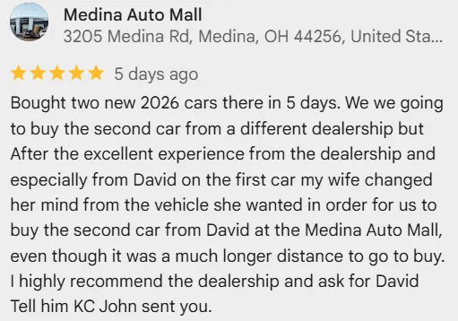 “We were going to buy the second car from another dealership, but after the excellent experience with David on the first one, my wife changed her mind. We drove farther just to buy our second car from Medina Auto Mall. I HIGHLY RECOMMEND THE DEALERSHIP — ask for David. Tell him KC John sent you.”