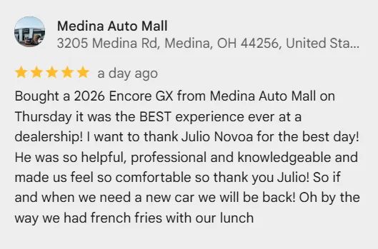 “I bought a 2026 Encore GX from Medina Auto Mall on Thursday and it was the BEST experience ever. Thank you to Julio Novoa for the best day! He was helpful, professional, knowledgeable, and made us feel so comfortable. WE'LL DEFINITELY BE BACK WHEN WE NEED ANOTHER CAR. Oh — and we even had french fries with our lunch!”