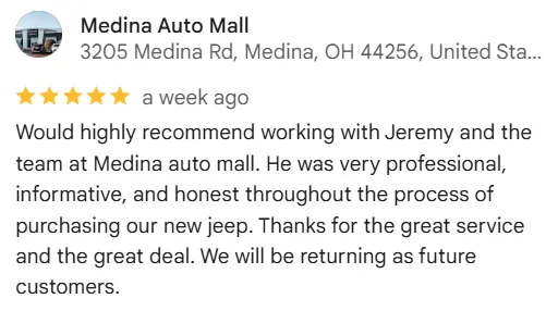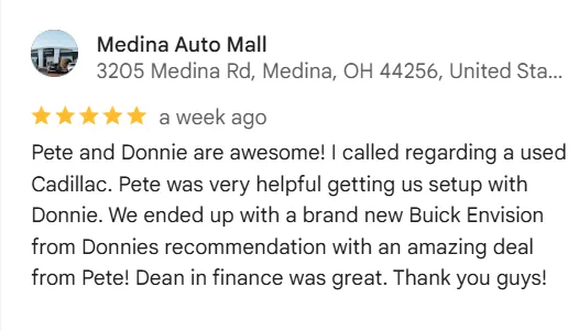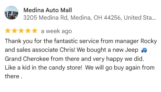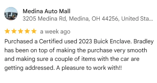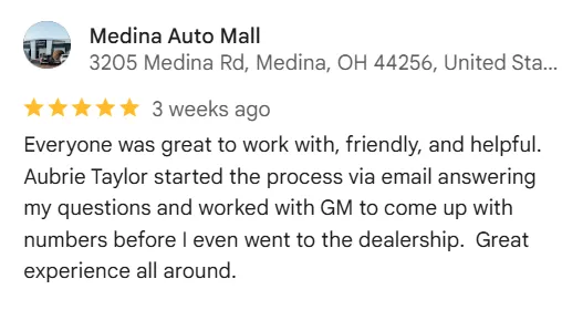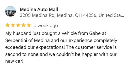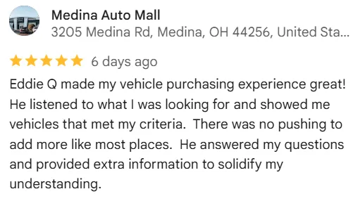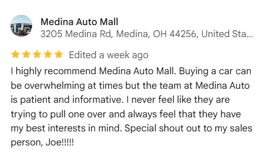 “I highly recommend Medina Auto Mall. Buying a car can be overwhelming at times, but the team is patient and informative. I never feel like they’re trying to pull anything over on me and always feel they have my best interests in mind. SPECIAL SHOUTOUT TO MY SALESPERSON, JOE!!!!!”